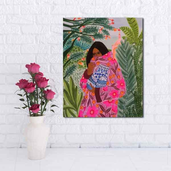تابلو بوم چاپی لاویا طرح زن با شال و کلاه قرمز