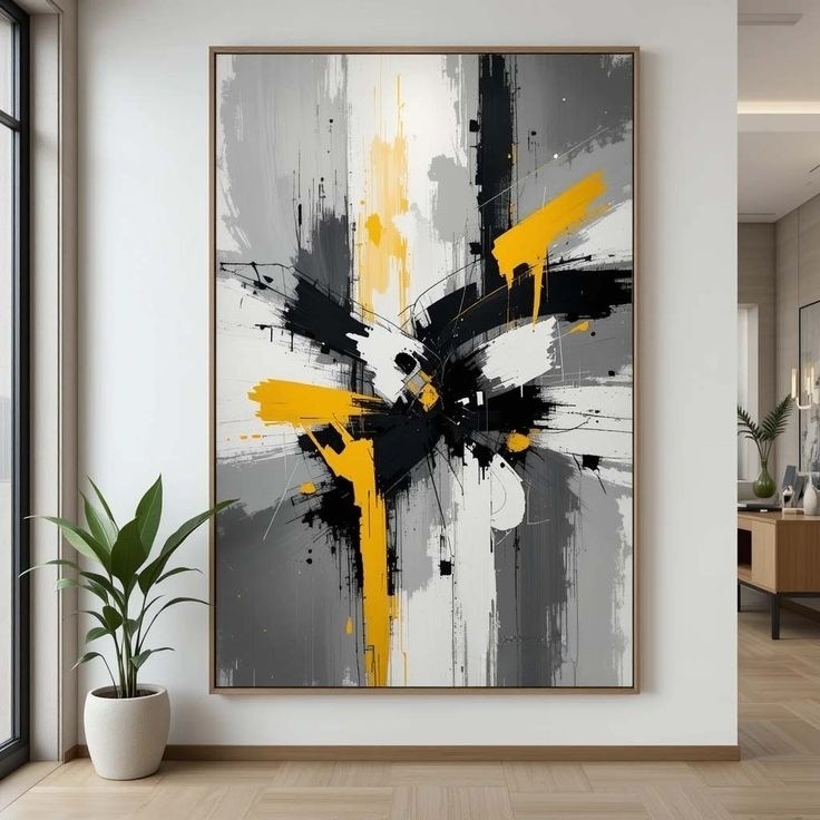 تابلو بوم چاپی لاویا طرح انتزاعی مدرن زرد و ژوسی و مشکی و سفید
