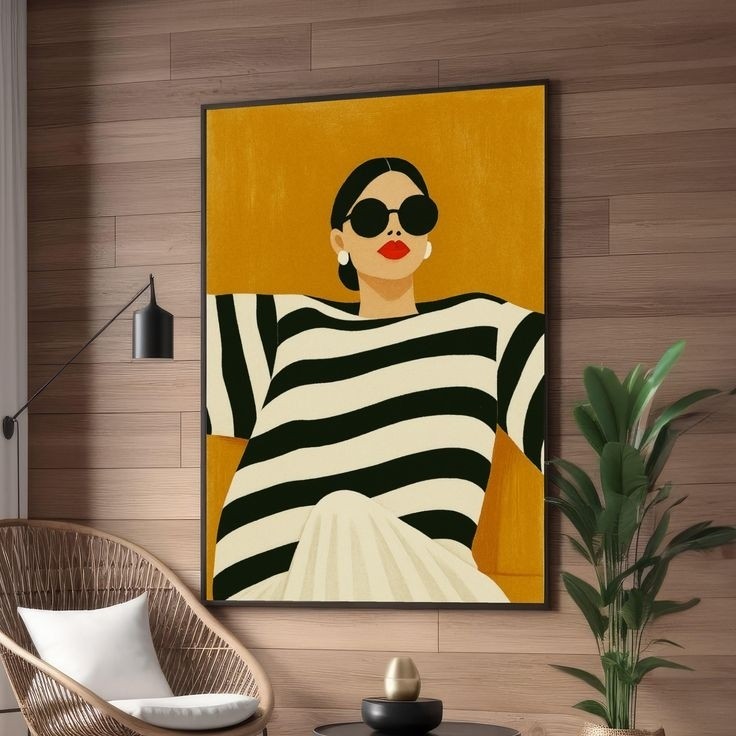 تابلو بوم چاپی لاویا طرح زن با عینک و لباس راه راه