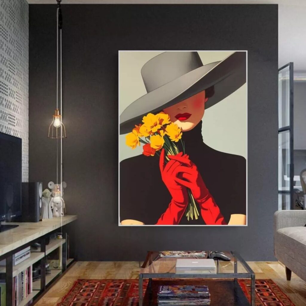 تابلو بوم چاپی لاویا طرح زن با شال و کلاه قرمز