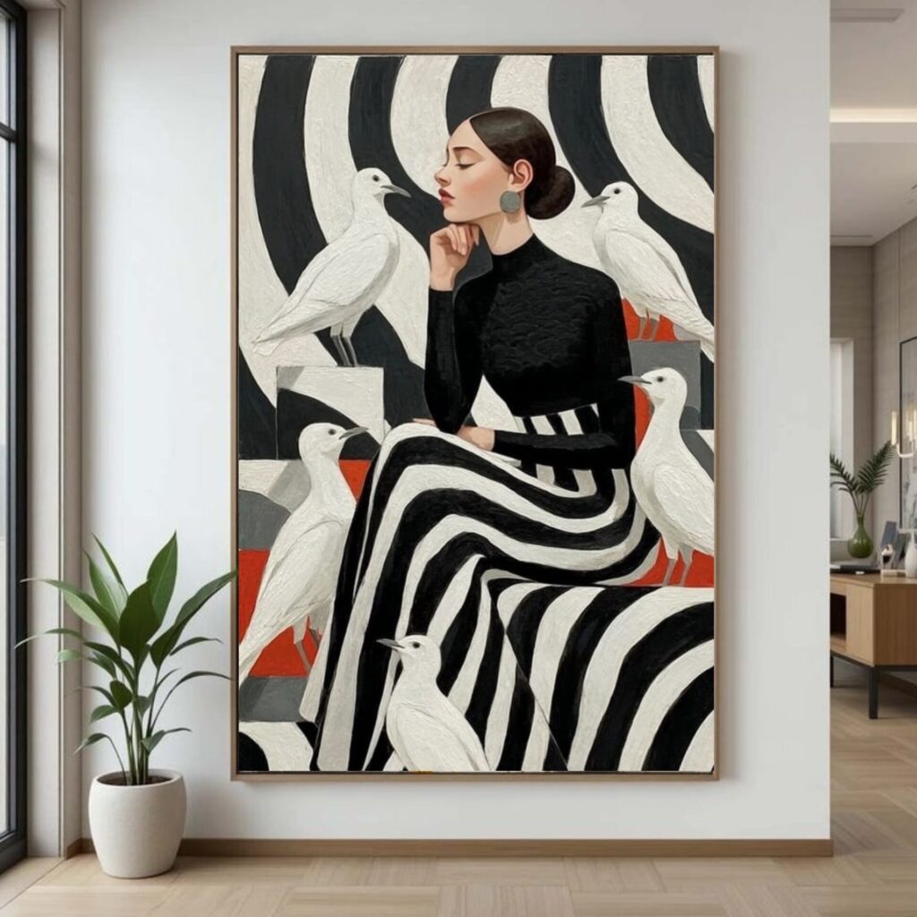 تابلو بوم چاپی لاویا طرح سیاه و سفید زن و پرنده ها