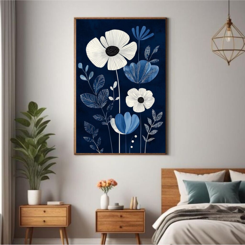 تابلو بوم چاپی لاویا طرح گلهای سفید زمینه سورمه ای