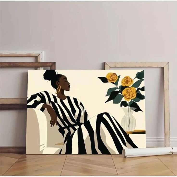 خانه دسته بندی تابلو بوم چاپی لاویا طرح گل و زن سیاهپوست با لباس راه راه