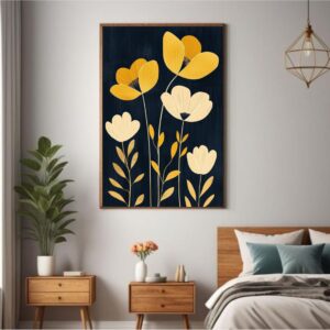 تابلو بوم چاپی لاویا طرح گل زرد با زمینه سورمه ای تیره